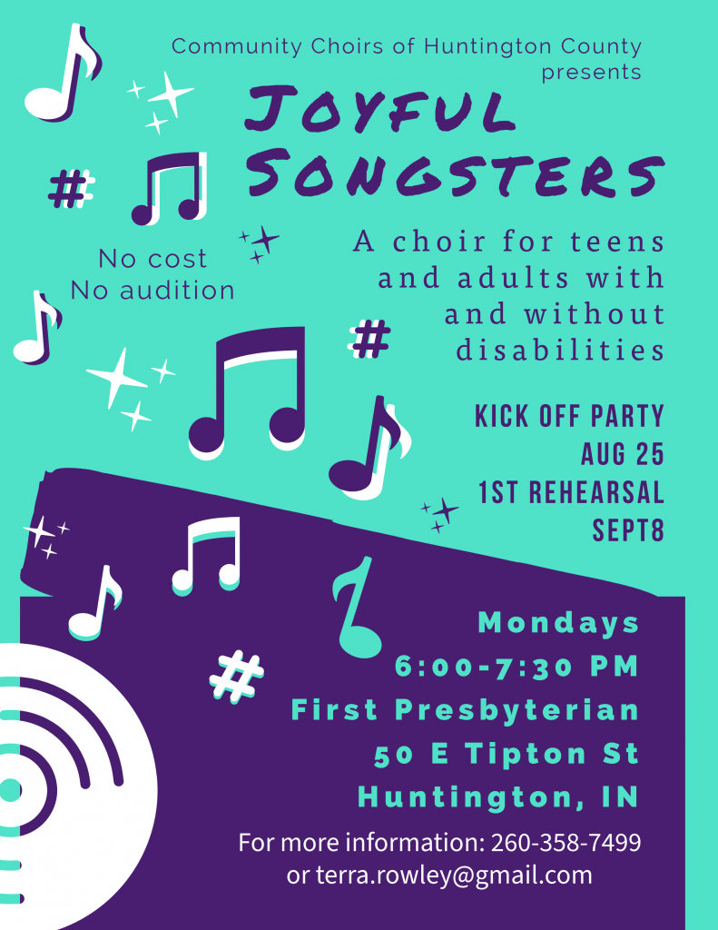 Joyful Songsters is a community choir that is open to all teens and adults, no audition required. It is designed to provide an integrated choral experience for those with and without disabilities. Choir members promote a sense of community involvement within their group and throughout the community while participating in high-quality music learning and performance. The Joyful Songsters is directed by Stephanie Schultz.