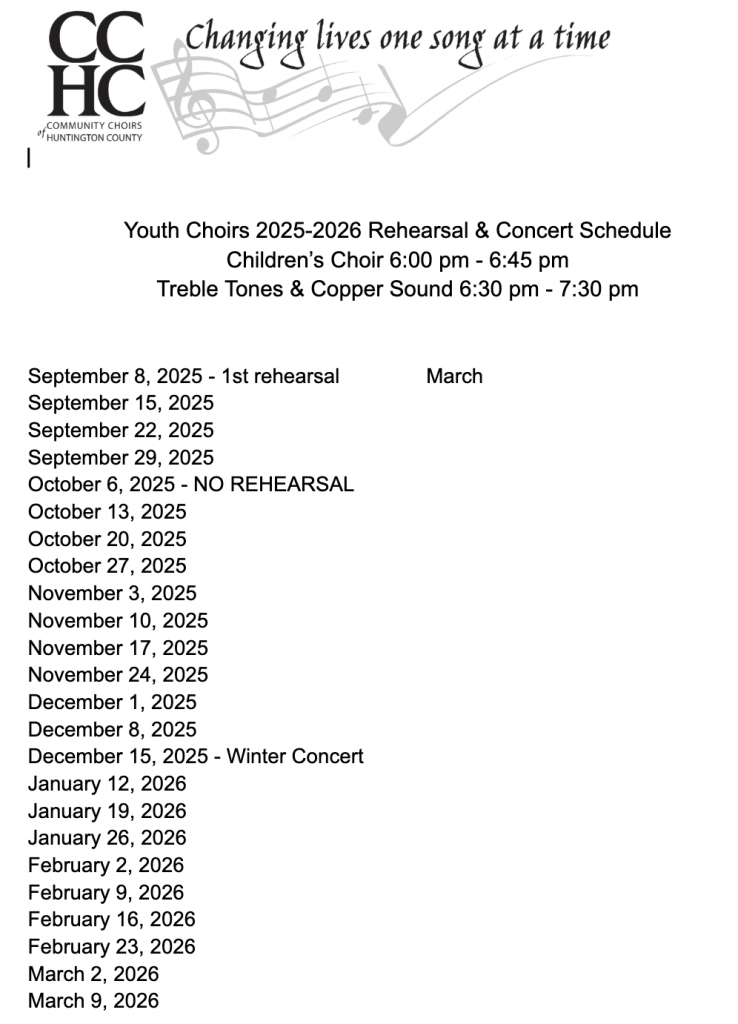 • Parent meeting will start at 6 pm for all students in Children’s Choir, Treble Tones & Copper Sound